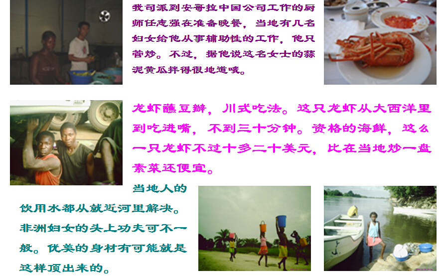 因環(huán)境保護得很好,河里的水非常清澈,當?shù)厝说牟途叨荚诤愚k清洗。安哥拉各地常見的大樹,當?shù)厝酥苣r在樹下通宵達旦地唱歌、跳舞。隨處可見的芒果樹上掛滿了芒果,雖然比中國的芒果小,但特別香、特別甜。任何人都可以隨手采摘。