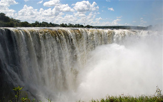 7月到次年3月為枯水季,維多利亞瀑布的全寬可盡收眼底,不過(guò)這時(shí)的水位可能很低。4月到6月是這里的汛期,水量為全年最大且水流湍急。那情景變得驚天動(dòng)地,贊比西河的狂濤怒波,以萬(wàn)馬奔騰之勢(shì)飛瀉而下,流量達(dá)旱季時(shí)的15倍。 整個(gè)維多利亞瀑布被霧氣包圍,游客看不到瀑布全貌。