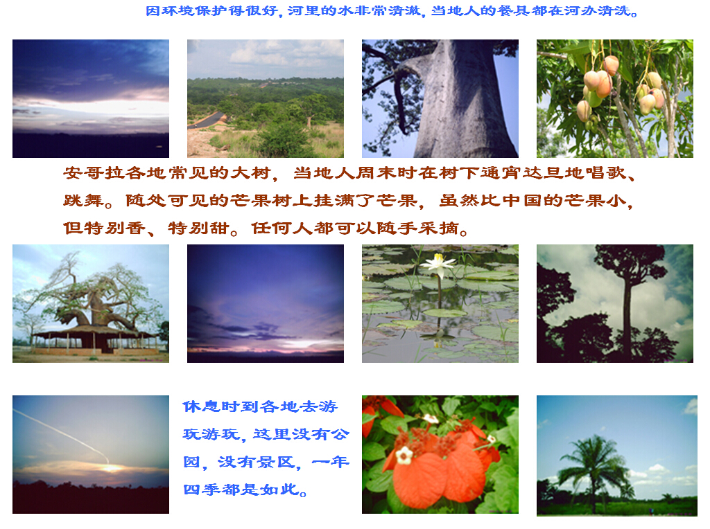 因環(huán)境保護得很好,河里的水非常清澈,當?shù)厝说牟途叨荚诤愚k清洗。安哥拉各地常見的大樹,當?shù)厝酥苣r在樹下通宵達旦地唱歌、跳舞。隨處可見的芒果樹上掛滿了芒果,雖然比中國的芒果小,但特別香、特別甜。任何人都可以隨手采摘。