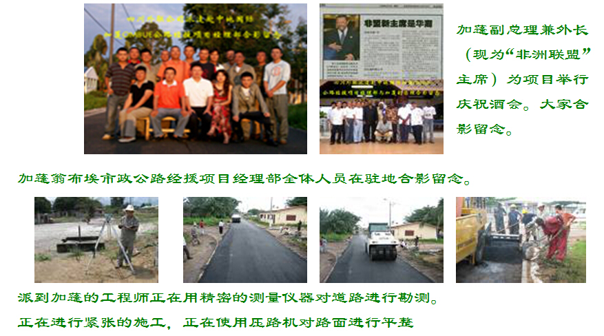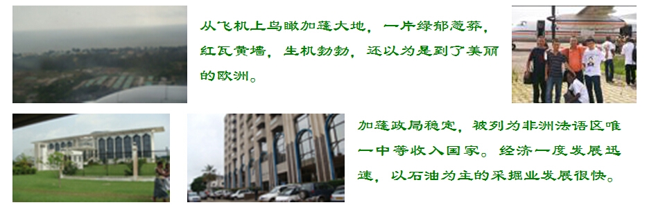 從飛機(jī)上鳥(niǎo)瞰加蓬大地,一片綠郁蔥莽,紅瓦黃墻,生機(jī)勃勃,還以為是到了美麗的歐洲。加蓬政局穩(wěn)定,被列為非洲法語(yǔ)區(qū)唯一中等收入國(guó)家。經(jīng)濟(jì)一度發(fā)展迅速,以石油為主的采掘業(yè)發(fā)展很快。加蓬年平均氣溫26℃,擁有豐富的森林資源,森林面積占全國(guó)土地面積的85%,被譽(yù)為非洲的“綠金之國(guó)”。加蓬的氣候很適宜植物的生長(zhǎng),美麗的出產(chǎn)的蔬菜瓜果品種繁多,真稱得上花朵,絢麗而多姿。加蓬副總理兼外長(zhǎng)(現(xiàn)為“非洲聯(lián)盟”主席)為項(xiàng)目舉行慶祝酒會(huì)。大家合影留念。加蓬翁布埃市政公路經(jīng)援項(xiàng)目經(jīng)理部全體人員在駐地合影留念。派到加蓬的工程師正在用精密的測(cè)量?jī)x器對(duì)道路進(jìn)行勘測(cè)。正在進(jìn)行緊張的施工,正在使用壓路機(jī)對(duì)路面進(jìn)行平整站在自己修建的馬路上,別有一翻滋味在海邊一處施工工地現(xiàn)場(chǎng)。