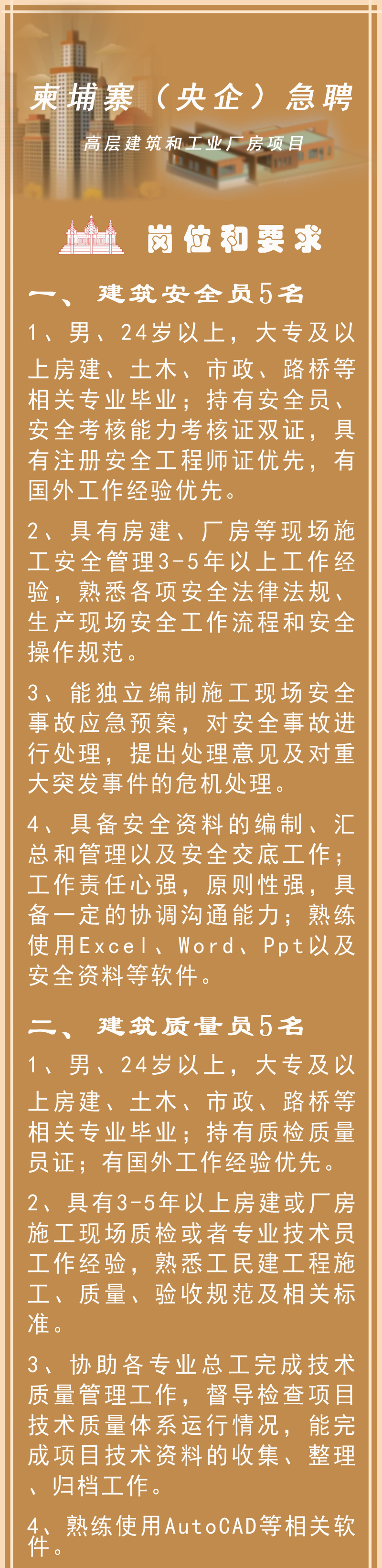 柬埔寨、科威特高層建筑和工業(yè)廠房項(xiàng)目招聘15人