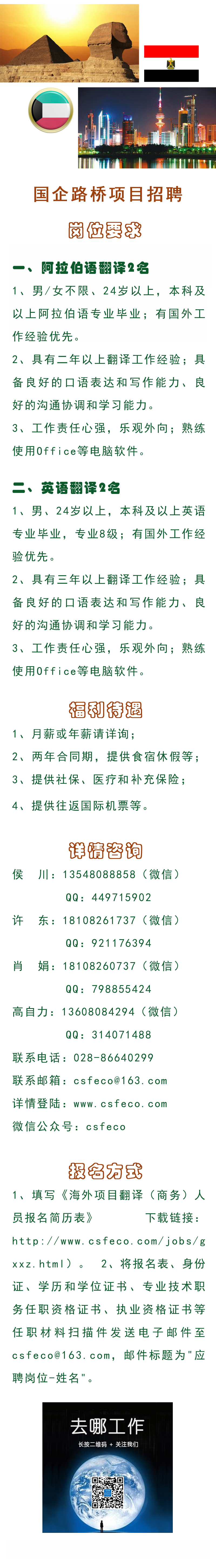 埃及、科威特國企路橋項(xiàng)目招聘4人